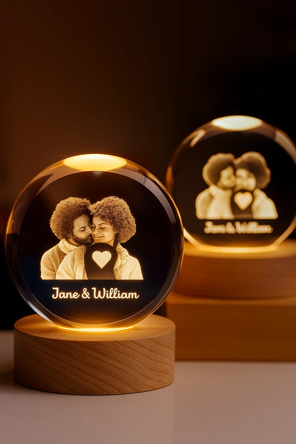 This stunning LED lamp transforms your photo into a beautiful 3D engraving inside a crystal clear glass sphere creating a timeless keepsake that shines with warmth and emotion.